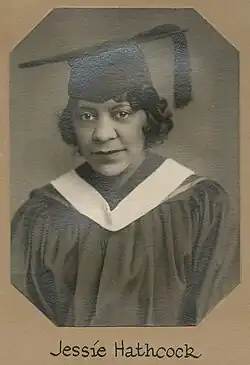 Jesse Valeria Scott was born in Worthington, Ohio. Her father was the eldest of nine siblings and put all eight of his younger siblings through college, which inspired her later devotion to education.[1] She started her higher education at Otterbein University before moving to Dayton in 1914 when she married Dr. Lloyd Hathcock (d. 1935).[2][3] In 1930, she completed her bachelor's degree in Education and became the first African American woman to graduate from the University of Dayton.[4] In May 1930, author and civil rights leader W.E.B. DuBois wrote to the university, inquiring about the number of African American students at the university for an upcoming article in the NAACP magazine The Crisis. In the university's response, Brother Joseph Muench, S.M., secretary to the university's president, notes that the only African American student at the time was Jessie S. Hathcock who had recently graduated with a "satisfactory" record.[5] According to Muench, while African American students were admitted to night classes and law school, they were generally barred from day classes due to the university's large number of students from Southern states.[6]
