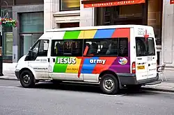 The UK general public were most likely to be aware of the Jesus Army by its brightly coloured minibuses and coaches and highly visible multi-coloured camouflage jacket often worn by Jesus Army evangelists on the street.[22] The Jesus Army was launched in 1987 as the campaigning identity of the Jesus Fellowship. Following the example of the early Salvation Army, and with a stated intention to "go where others will not go",[23] the Jesus Army engaged in what has been called "aggressive and effective street evangelism among the marginalized sections of society".[24] The Jesus Army's mission was described as "essentially one to the poor, the disadvantaged and the marginalized".[25] Since 1987 The Jesus Army held an annual high-profile gospel event in London called London Jesus Day[26] with a three-hour public event on Trafalgar Square, then (until 2005) an evening event in a marquee on Roundwood Park.
