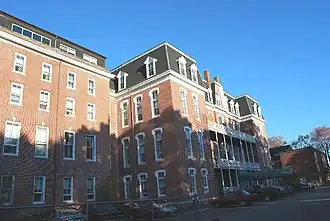 The four story Second Empire brick convent was built as part of Notre Dame Parish. The west facing central tower with its Italianate window lintels is blocked forward and dentils adorn the cornice line. A detached auditorium was added in 1939 to the north of the main structure. Until 1971, the building also housed Jesus Marie Academy, a private high school for girls. In the mid-1970s, the academy was renovated into a retirement center-infirmary for retired religious.[2]
