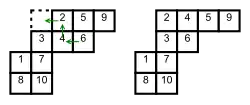 Given a skew standard Young tableau T of skew shape , pick an adjacent empty cell c that can be added to the skew diagram ; what this means is that c must share at least one edge with some cell in T, and must also be a skew diagram. There are two kinds of slide, depending on whether c lies to the upper left of T or to the lower right. Suppose to begin with that c lies to the upper left. Slide the number from its neighbouring cell into c; if c has neighbours both to its right and below, then pick the smallest of these two numbers, favoring the one below. (This rule is designed so that the tableau property of having increasing rows and columns will be preserved.) If the cell that just has been emptied has no neighbour to its right or below, then the slide is completed. Otherwise, slide a number into that cell according to the same rule as before, and continue in this way until the slide is completed. After this transformation, the resulting tableau (with the now-empty cell removed) is still a skew (or possibly straight) standard Young tableau.