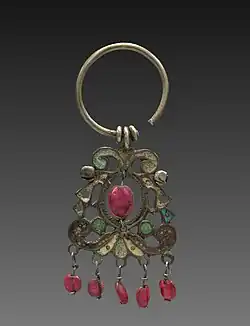 Egyptian designs were most common in Phoenician jewellery. Also, ancient Turkish designs found in Persian jewellery suggest that trade between the Middle East and Europe was not uncommon. Women wore elaborate gold and silver pieces that were used in ceremonies.[28]