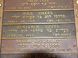 - ^ On the plaques above see the name Max Siegel, Siegel's father, whose Hebrew name is "Mordechai Dov ben Reb Beirush HaLevi" (from the Hebraic tribe of the Levites) and the one for Siegel, whose Hebrew name is "Bairush HaLevi ben Reb Mordechai Dov HaLevi;" from this we see that Bugsy was named for his grandfather, Dov, meaning bear (Bairush is the Yiddish for Dov), which was Americanized to Benjamin. All fathers are called Reb as an honorific on memorial plaques; Reb means "teacher" as in Rabbi.