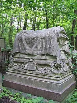 In 1806 Warsaw's Jewish Commune petitioned the government to establish a new cemetery for Jewish inhabitants of Warsaw.[2] The Bródno Jewish Cemetery, in existence since 1769, was nearly at capacity and the chevra kadisha sought a new burial ground.[3] The lot chosen was located right outside of the city limits in the borough of Wola, next to a new Catholic Powązki Cemetery established in 1790. The petition was accepted and in the following year the cemetery was established. The earliest headstone was dated December 6, 1806 and belonged to certain Nachum son of Nachum of Siemiatycze, but it did not survive to our times. The first woman interred there was certain Elka Junghoff, daughter of Jehuda Leib Mulrat of Kalisz. Her tombstone is dated November 26, 1804, but the date is most likely wrong. Hence the oldest surviving headstone belongs to Sara, daughter of Eliezer (died September 8, 1807).[4]
