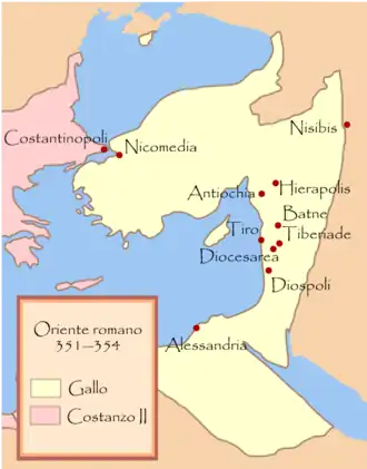 The Jewish revolt against Constantius Gallus, also known as the Gallus Revolt, erupted during the Roman civil war of 350–353, upon destabilization across the Roman Empire. In 351–352, the Jews of Roman Palaestina revolted against the rule of Constantius Gallus, brother-in-law of Emperor Constantius II and Caesar of the eastern part of the Roman Empire. The revolt was crushed by Gallus' general Ursicinus.