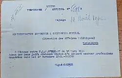 A telegram from the governor of Mahajanga, dated 14 April 1942, reporting that two Jews in the region had identified themselves in accordance with Vichy anti-Jewish legislation