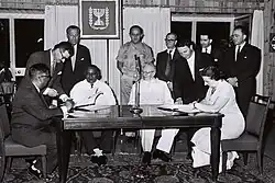 President Philibert Tsiranana of Madagascar, Foreign Minister of Israel Golda Meir, and Israeli President Yitzhak Ben-Zvi signing a treaty of friendship and mutual assistance in 1961.