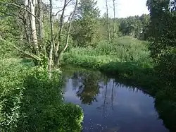 Initially, the river flows east, turns north in Gościeńczyce, and turns east again near Jazgarzew. In its upper course, on a section of several kilometers from the village of Wygnanka to the village of Wilczoruda, the river flows through fish ponds dug in its bed.[2] It crosses the ponds in Żabieniec, where it has been supplied with water from the Czarna Canal since 1973.[3] The Mała stream flows into the Jeziorka at Konstancin-Jeziorna.[4] In the last section, it crosses the Wilanówka stream, which flows under Jeziorka through a culvert and does not flow into it. The Jeziorka enters the Vistula near Obórki village, about 6 kilometres (4 mi) north-east of Konstancin-Jeziorna.[5]