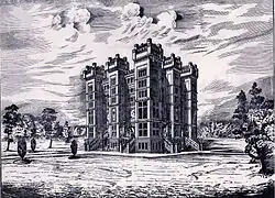 Jezreel wanted the new HQ to be a perfect cube, each side 144 ft long. The architects, however, persuaded him the design was impractical and he agreed to modified version—124 ft on each side and 120 ft high at each corner. It was to be built of steel and concrete with yellow brick walls and eight castellated towers. The trumpet and flying roll, crossed swords of the spirit and the Prince of Wales feathers (signifying the Trinity), were to be engraved on the outer walls.[3]