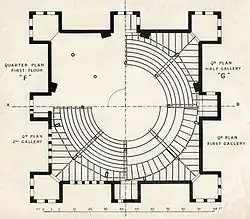 A circular platform in the centre of the assembly room floor was designed to rise under hydraulic pressure to a height of 30 ft. On it, the choir and preachers would rotate slowly.