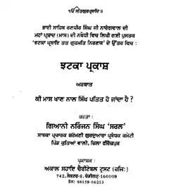 Jhatka Parkash (Punjabi: ਝਟਕਾ ਪ੍ਰਕਾਸ਼), also called Jhatka Parkash Granth, is a book written by Giani Niranjan Singh Saral, a leading preacher of the SGPC, concerning historical, philosophical, etymological and theological aspects of Jhatka and Meat eating in Sikh Religion.[1][2]