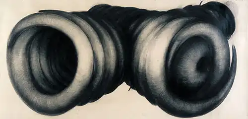 Giant objects from the beginning of the 1990s offer perfect spatial illusion of voluminous figures of organic shape (And out/aerial meditation, charcoal on cardboard, 220 x 500 cm, 1990–1992, It, charcoal on cardboard 220 x 480 cm, 1989–1992). The time range of their creation bears witness to how technically demanding these drawings are.