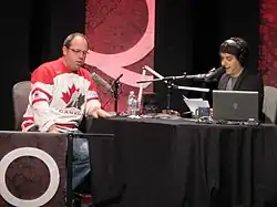 From April 16, 2007, to October 26, 2014, Ghomeshi was the host of Q, a program airing twice daily on CBC Radio One, and on over 170 stations in the U.S. through Public Radio International. As the host of Q, he interviewed a range of musicians, artists, actors, and other notable figures, a list that included Woody Allen, Paul McCartney, Salman Rushdie, Barbara Walters, William Shatner, Jay-Z, Jimmy Wales, and Leonard Cohen.[3] In 2012, Ghomeshi received the Gold Award for best talk show host at the New York Festivals' International Radio Awards.[13] By 2013, with Q had a weekly audience of more than 2.5 million listeners weekly in Canada and 550,000 listeners in the U.S.[33] During his time as host of Q, Ghomeshi many times booked guests who shared his agent and lawyer without disclosing this connection.[34]