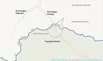 The route followed by the Gorkha platoon is not recorded in Indian military history, but it is known that there were only two routes available to them: through the Changlung Valley or via the Jianan Pass.[22] Since Shamal Lungpa in the Changlung Valley was already occupied by the Chinese forces (Map 3), the Jianan route seems more likely. The post set up by them was in the Shimengou valley, north of the pass, close to the confluence of Shimengou with the Galwan River. China provided the coordinates of the post and described it as "six kilometres inside Chinese territory in the Galwan Valley area".[16]