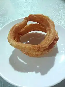 Jiao quan (Chinese: 焦圈; pinyin: jiāoquān; or xiaoyougui; also called fried ring) is a dish from Beijing cuisine. It has a golden color and is shaped like a bracelet. It feels crispy and crunchy when eaten. The unique taste of it is very popular in Beijing cuisine.[1] People usually eat jiaoquan with shaobing and douzhi.