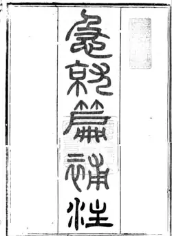 The title Jíjiùpiān uses the word piān 篇, which is attested in Han dynasty texts with the meaning of "book, written document" (such as in the Hanshu 漢書 chapter on Wu Di, "著之於篇,朕親覽焉。"[1]). Several other Chinese dictionary titles use pian, for example, the (c. 500? BCE) Shizhoupian "Historian Zhou's Chapters" (c. 220 BCE) Cangjiepian "Cangjie's Chapters" (c. 543) Yupian "Jade Chapters", and (1066) Leipian "Categorized Chapters".
