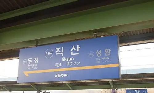 - ^ a b 직산역 (in Korean). KRIC. Retrieved 2015-12-20.