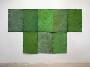 O’Bryan’s ground rubbings, or frottages, represent a more outward-focused aspect of her work.[4] She began these highly physical drawings in 2006 as a way to connect to and record her corporeal interactions with the New Mexico desert land.[5][2][25] They were made by laying out large sheets of white paper on the mesa, then lying on top of the paper and making rubbings with chunks of graphite to reveal impressions and pull out the texture of the rocks below.[6][13][26] Reviewers have likened these works (e.g., the 12-foot-tall, scroll-like Untitled #10, 2008 or NM.1.22, 2022), variously, to human skin or X-rays,[2] topographical maps or entire landscapes,[27][1] grave-rubbings,[28] and Australian Aboriginal drawings.[29] They have suggested that her mark-making in these drawings embeds the landscape into paper (rather than describing it), facilitating its organic emergence from the white surface.[5][29] Paul Ardenne described the marked paper as "both the surface of inscription and of exchange … equivalent to a situation of intercession: art makes nature speak, and nature makes art speak."[24]