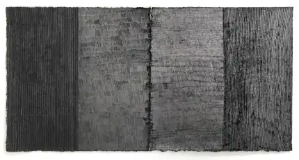 In her "Tonglen Breath Drawings" (2011–12), O'Bryan drew upon the concept of Tonglen breathing, a Buddhist practice of compassion in which practitioners breathe in another's pain, transform it, and breathe out healing.[13][22] In these smaller works (e.g., 18,200 breaths between 4/1/2012 and 4/19/2012), she layered marks atop one another 20 times (equating to 20 breaths) until the rice paper became incised and frayed under the weight of the accumulated graphite; critic Edith Newhall described the resulting surfaces as resembling, "square, monochromatic pieces of a woolly patterned textile."[2][15][5]