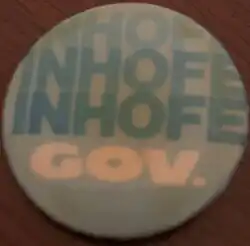 Inhofe had been floated as a potential gubernatorial candidate since 1972.[63][64] Inhofe was considered a strong Republican candidate with his only weaknesses being his feuding with Leo Winters and the backlash to the USS Batfish project.[65] By May 1973, he was openly campaigning, but had yet to officially announce his campaign.[66] In October of that year, he was polling behind Denzil Garrison in the Republican primary 35% to 65%.[67] Inhofe officially launched his campaign in May 1974.[68] The main issue in both the Republican and Democratic primary campaigns was corruption during the term of incumbent Democratic governor David Hall.[69] Inhofe defeated Garrison in the August primary.[70] During the campaign, he lost 57 pounds and was down to 148 pounds.[71]