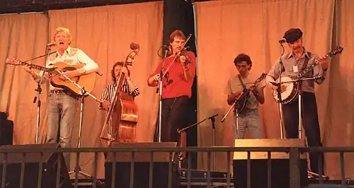 In the early eighties, he reformed ‘'The Blue Velvet Band’' for occasional concerts, under the name ‘'New Velvet Band’',[9] with Kenny Kosek on fiddle (in place of Richard Greene, who lives in California). He also tours Europe twice with Bill Keith, first with Peter Rowan.[10] Later, in 1985,Bill Keith and Jim Rooney performed at the Cambridge Folk Festival (UK) with fiddler Mark O'Connor, who made his European debut.[11]