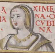 Jimena's origin has been subject to scholarly discussion and debate. Her patronymic indicates that her father was named Munio, and a contemporary chronicler, Bishop Pelagius of Oviedo, called her nobilisima (very noble), while the Crónicas anónimas de Sahagún describes her similarly, muy noble.[2] The 17th-century historian Luis Alfonso de Carvallo made her sister of Galician count Rodrigo Muñoz and daughter of count Munio Rodríguez by his wife Jimena Ordóñez, granddaughter of king Bermudo II of León. In this he was followed the next century by church historian Enrique Flórez, but both the chronology and the politics would seem to militate against this placement.[3] She would appear to be the woman of this name in charters of the monastery of San Pedro de Montes along with a Munio Muñoz and his wife Velasquita. With Munio appearing to be too old to have been her brother, historian Quintana Prieto suggested that these were Jimena's parents. He likewise suggests that Munio was the count of this name who accompanied Alfonso to Seville.[4] Other historians have accepted this relationship, and, further, have made Munio Muñoz a son of Munio Rodríguez and Jimena Ordóñez, by which connection Jimena would be a descendant of Bermudo II.[5][6]
