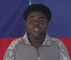 Jimmy Chérizier (French pronunciation: [dʒimi ʃeʁizje]; born 30 March 1977), nicknamed Barbecue (Haitian Creole: Babekyou), is a Haitian gang leader, disgraced former police officer, and warlord[3] who is the head of the Revolutionary Forces of the G9 Family and Allies (Haitian Creole: Fòs Revolisyonè G9 an Fanmi e Alye), abbreviated as "G9" or "FRG9", a federation of over a dozen Haitian gangs based in Port-au-Prince.[4][5] Known for often making public appearances in military camouflage and a beret,[6] he calls himself the leader of an "armed revolution".[7] Considered the most powerful warlord in Haiti, he is currently believed to be one of the country's most powerful political figures.[8][2][9]