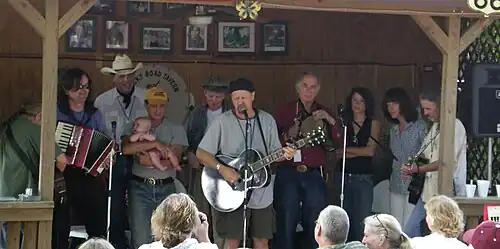 In 1998, LaFave began attending the annual Woody Guthrie Folk Festivals held in Guthrie's hometown of Okemah, Oklahoma and in 2007 became a member of the Woody Guthrie Coalition that organizes the festival.[14][15] LaFave says Woody Guthrie is his musical hero[16] and pays homage to him in the song "Woody Guthrie" on the Texoma album.[17] Album reviewers described it as "reminiscent of the Dust Bowl heritage of Woody Guthrie, the early rock of Chuck Berry, the quiet folk reflections of Bob Dylan, and the rock anthems of Bruce Springsteen"[18] and "honest, thoughtful and sincere" music.[15] LaFave's "red dirt music" sound has been described as a mix of rock, folk, rockabilly, and country, grounded in the landscape of Texas and Oklahoma and can be heard on this album.[9]