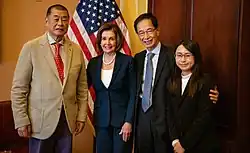 Between July and November 2019 Lai was able to meet with US Vice President Mike Pence and later with US House Speaker Nancy Pelosi to discuss the Hong Kong protests. Lai said, 'We in Hong Kong are fighting for the shared values of the US against China. We are fighting their war in the enemy camp.'[87] Pelosi published a photograph of herself, Lai, along with Martin Lee and Janet Pang and supporting words to the Hong Kong protesters.[88][89] Lai also later met with then US National Security Adviser John Bolton. Bloomberg reporter, Nicholas Wadham tweeted that the meeting was meant to send a signal to Beijing, as it was very "unusual for non governmental visitors to get this kind of access".[90]