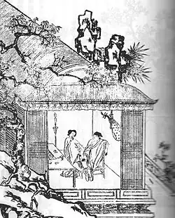 Jin Ping Mei (Chinese: 金瓶梅)—translated into English as The Plum in the Golden Vase or The Golden Lotus—is a Chinese novel of manners composed in vernacular Chinese during the latter half of the 16th century during the late Ming dynasty (1368–1644). Consisting of 100 chapters, it was published under the pseudonym Lanling Xiaoxiao Sheng (蘭陵笑笑生), "The Scoffing Scholar of Lanling,"[1] but the only clue to the actual identity is that the author hailed from Lanling County in present-day Shandong.[2] The novel circulated in manuscript as early as 1596, and may have undergone revision up to its first printed edition in 1610. The most widely read recension, edited and published with commentaries by Zhang Zhupo in 1695, deleted or rewrote passages to help understand the author's intentions.[3]