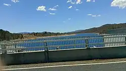 Completed in 1967, Jindabyne Dam is a major dam, located approximately 2 kilometres (1.2 mi) south south-east of the relocated town of Jindabyne. The dam was constructed by a consortium of Utah-Brown and Sudamericana based on engineering plans developed under contract by the Snowy Mountains Hydroelectric Authority.[1] Construction of the dam flooded the settlement of Old Jindabyne that accommodated approximately 300 people.[1] Parts of Old Jindabyne can be seen when the levels of Lake Jindabyne are low. The settlement of East Jindabyne is located above what was Old Jindabyne.[2]