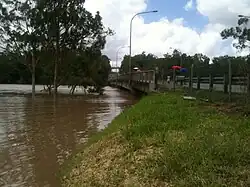 The 1974 floods caused extensive damage to Jindalee, including inundation of many houses, as well as severe damage to the Centenary Bridge. A gravel barge rammed into the upstream side, blocking the floodwaters and raising real fears that the bridge would collapse. The barge was partly sunk using explosives to reduce pressure on the bridge. When the floodwater receded, the barge was refloated and beached downstream to be cut up for scrap. The damage sustained by the bridge required its partial closure for repairs. For two years after the floods, the bridge was reduced to a single lane. The bridge was duplicated in 1980, providing two lanes each way.