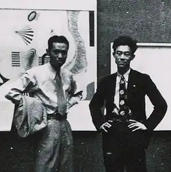 In 1954 Yoshihara co-founded the Gutai Bijutsu Kyōkai (Gutai Art Association) with some of his students and young Genbi participants (Masatoshi Masanobu, Shōzō Shimamoto, Chiyū Uemae, Tsuruko Yamazaki, Toshio Yoshida, his son Michio Yoshihara, and Hideo Yoshihara). The founding of Gutai coincided with Yoshihara's appointment to managing director of Yoshihara Oil Mill company following his father's death in December 1954. Gutai's namesake journal, which was first issued in January 1955, documented the group's activities in 14 issues through 1965, reviving his aspiration with Kyūshitsukai's publication and emulating Bokujinkai's strategy of international networking via its magazine.[26] Over the following months, the group underwent substantial changes. More than half of the founding members left, some frustrated by Yoshihara's prioritization of the journal over actual exhibitions.[27] However, Gutai also gained new members in response to Yoshihara's invitation: they included Akira Kanayama, Saburō Murakami, Atsuko Tanaka, and Kazuo Shiraga, who belonged to a small artist group Zerokai (Zero Society) and also affiliated with Shinseisaku Kyōkai (New Creations Association). Yoshihara and the group also recruited Sadamasa Motonaga, Yasuo Sumi and Yōzō Ukita, who also joined later in 1955.