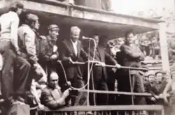 When the strike broke out, Ceaușescu and his wife Elena were on a Black Sea vacation. At Verdeț's insistence, he hastily came to Petroșani on 3 August 1977, and 35,000 people (some sources say 40,000)[6] came to see him – to be sure, not all had come to hold a dialogue with him, but went out of curiosity or carried away by events, but the audience was nonetheless impressive in size. At first, despite the charged atmosphere, some shouted "Ceaușescu and the miners!", but others yelled "Lupeni '29! Lupeni '29!" (in reference to the Lupeni Strike of 1929, enshrined in the mythology of the Romanian Communist Party), in an effort to add legitimacy to their cause.[1][6] Dobre read the list of grievances to Ceaușescu, presenting 26 demands related to work hours, production targets, pensions, supplies, housing and investments. They asked for a restoration of the status quo ante in social legislation, the guarantee of adequate food supplies and medical care, the establishment of workers' commissions at the enterprise level empowered to dismiss incompetent or corrupt managers, and a pledge of no reprisals against the strikers.[7] After that, Dobre recalled, "While my name was being shouted, I turned toward Ceaușescu, gave him the list from which I had read and he said to me: 'Thank you for informing me, comrade'. Once in front of the microphones, Ceaușescu was not allowed to speak. Some were booing him, others shouted that they wouldn't go into the mine, and from afar one could hear my name. In vain the appeals for quiet with raised arms from the activists on the podium".[3]