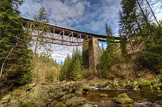 It is a steel bridge towering on granite pillars over the Jizera river. It crosses the valley between the Jizera Mountains and the Giant Mountains. The bridge was built as part of the Hirschberg (now Jelenia Góra) - Grűnthal (later Polubný, now Kořenov) railway line (at that time running on the Prussian territory).[4]
