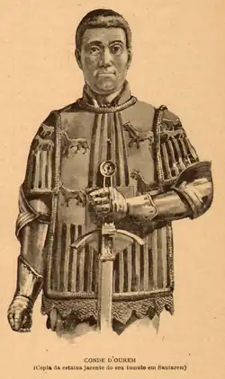 João Afonso Telo was a trusted advisor of King Pedro I and his son King Fernando I of Portugal, married to his niece, Leonor Teles.[7] He was also the alferes-mor of King Pedro I who on 10 October 1357 made him Count of Barcelos[4] and appears with the title of Count of Ourém in December 1371 after King Fernando I had given him the town of Ourém in January of the previous year but without the title of count at that time.[8]