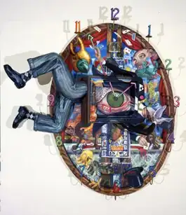 By the end of the 1980s, Carson returned to more sculptural work that reviews noted for its heightened urgency, increasingly surrealist sensibility, and disturbing references to the body, fractured identity, loss and desire.[41][42][25] Carnival of Values (1990) typified this work; it was a large oval canvas featuring a Magritte-like, bowler-capped man layered over an affixed television chassis with protruding arms and legs and a great eye in the center, surrounded by clock-like, three-dimensional numerals and an inverted hat filled with sloshing blood.[42] This work culminated with the larger-than-life, transitional figure-plant relief, Tree of Desire (1993), whose form and fecund symbolism signaled Carson's coming embrace of the nature-related imagery.[7]