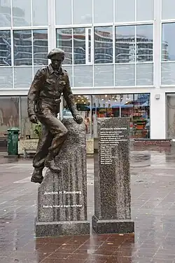 In 1943, he was awarded Norways's highest decoration for military gallantry, the War Cross with sword.[26] For his war service Rønneberg also received St. Olav's Medal With Oak Branch, Defence Medal 1940–1945 and Haakon VIIs 70th Anniversary Medal.[27][28] In addition to his Norwegian decorations, he was also decorated by the British with the Distinguished Service Order (DSO),[29] by the Americans with the Medal of Freedom with silver palm and by the French with the Legion of Honour and Croix de Guerre.[28] In 2015, Håkon Anton Fagerås made a statue in bronze of Rønneberg on commission. It was unveiled by Princess Astrid in Ålesund.[30]