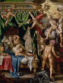 Mars and Venus Surprised came from Ovid, and was usually one of the scenes shown in illustrated editions.[37] Wtewael's approach to this subject too can be traced back to Spranger and Goltzius, and a drawing of 1585 by the latter (now in the Getty Museum) is close to Wtewael's several compositions, with a scrum of figures hovering over an elaborate bed. Drawings by Bloemaert may also have had an influence.[38]