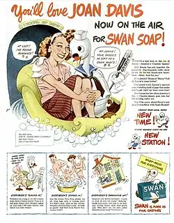 Davis entered radio with an August 28, 1941, appearance on The Rudy Vallee Show and became a regular on that show four months later. Davis then began a series of shows that established her as a top star of radio situation comedy throughout the 1940s. When Vallee left for the Coast Guard in 1943, Davis and Jack Haley became the co-hosts of the show. With a title change to The Sealtest Village Store, Davis was the owner-operator of the store from July 8, 1943, to June 28, 1945 when she left to do Joanie's Tea Room on CBS from September 3, 1945 to June 23, 1947.[8] Sponsored by Lever Brothers on behalf of Swan Soap, the premise had Davis running a tea shop in the little community of Smallville. The supporting cast featured Verna Felton. Harry von Zell was the announcer, and her head writer was Abe Burrows, formerly the head writer (and co-creator) of Duffy's Tavern and eventually a Broadway playwright.