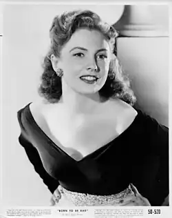 She auditioned for Paramount's Holiday Inn (1942), but Warner Bros. decided to cast her in Yankee Doodle Dandy (also 1942) with James Cagney.[25] The film is a musical depicting the life of Broadway entertainer George M. Cohan.[26] Leslie portrayed his girlfriend/wife Mary, an aspiring singer.[27] The film received eight Oscar nominations, including a Best Actor award for James Cagney.[28] By now, Leslie had become a star whose on-screen image was described as "sweet innocence without seeming too sugary."[1]
