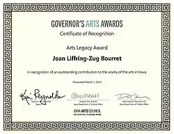 On March 1st, 2023, Joan was posthumously presented with the Arts Legacy Award by Iowa Governor Kim Reynolds and the Iowa Arts Council. [6]