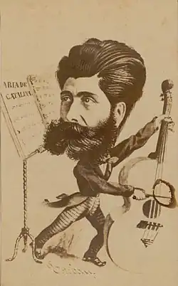 On 19 December 1863, his La conquista de Madrid premiere at the Teatro de la Zarzuela, with libretto by Luis Mariano de Larra.[6] In 1865, he was hired as conductor for the Teatro de los Campos Eliseos, in Madrid, in one of the first performances of the music of Richard Wagner.[1] In 1868, he was appointed director and chairman of the Sociedad de Conciertos de Madrid, where the opera Tannhäuser premiered.[7] The same year he toured Cuba with his own company and flew to Mexico because of a major revolt,[8] returning to Spain in 1870 with serious health problems and financially ruined.[8] He died as a result of severe liver disease shortly after arriving to Madrid.[8]