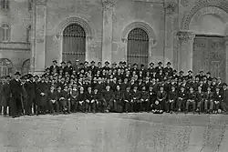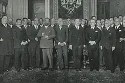 Throughout the 19th century Manglano's ascendants did not demonstrate clear political penchant: the Barón de Llaurí family is listed as traditionally pro-Liberal, Barón de Cárcer family as traditionally ambiguous and Barón de Terrateig traditionally Carlist.[37] However, in the early 20th century his father was clearly active as a Conservative. The young Joaquín, apart from having been first noted as joining Orden de Montesa in 1909,[38] during his academic years engaged in emerging Catholic initiatives; they are currently classified as falling somewhere in-between Christian Democracy and Social Catholicism. Influenced by Herrera Oria and ACNDP, in 1912 Manglano was recorded as active in catolicismo agrario, visiting local Levantine villages[39] and advocating workers’ self-organization;[40] in 1913 he contributed himself to setting up Sindicato Cátolico Agrario.[41] In the mid-1910s he was also active in the Valencian Centro de Jovenes para la Defensa Social and together with his father took part in initiatives bringing together various breeds of ultra-conservative groupings, apart from the Conservatives including the Integrists and the Jaimists.[42]
