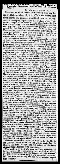 - ^ "The Head of Joaquin Murieta not Taken – A Strange Story", Alta California, August 23, 1853, p. 2,