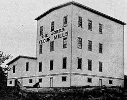 Following his death his sons, Allan R. and William Haskell Jobes took over the ownership of the mill.[6] They sued the City of St. Johns in 1910 saying that a planned sewer would runoff into their property. A judge allowed the city to continue with the construction.[7] William Haskell Jobes died of heart disease in 1911, leaving his brother Allan R. Jobes as the sole owner.[1] By 1917 the mill was producing 500 barrels of flour per day. In 1918 the mill was purchased by the Rose City Flour Mill, who used it as a subsidiary. The new owners planned to double the production of barrels per day.[6] Allan R. Jobes died in 1920.[8] The flour mill was demolished in 1930 and a lumber mill was constructed in its place.[9]