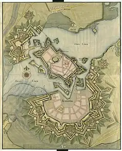 In 1684, he would begin expanding Rendsburg's fortified works south. Here he established the new citadel Nyværk. This defensive complex was built in the typical modern style of the age of Vauban, sporting a grand central parade ground with radial streets emanating from it. Those streets lead out to the walls of the polygon-shaped citadel.[13] This citadel had six bastions, as well as ravelins and other outer defensive barriers. Nyværk itself was larger than the entirety of Rendsburg's old fortifications, and stretching south it went beyond the borders of Schleswig and down into Holstein. Between 1690 and 1695 Scholten furthermore expanded the city's fortifications north with the new Kronværk, placing it where a small village on the northern Eider bank had lied previously.[11] The Kronværk was smaller than the Nyværk, and it also had both ravelins and other defensive works guarding its walls. Scholten made Rendsburg into the most modern fortress in the realm, and the only other fortress classed as 'first class' other than Copenhagen.[14]