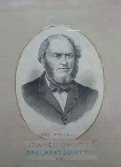 From 1852 to 1854 Winter earned a great amount of money and bought sheep stations for his two sons. In his well-known selling of Bonshaw, he earned £23,000 for a portion of the 640 acres, which he purchased at £1 per acre, and obtained £50,000 from the Winters Freehold Company for 1359 acres. He purchased a great amount of land from nearby colonies. After his first wife's death, he remarried and lived frugally on a secluded house at the top of Stuart St., reputed to be a millionaire. He died in August 1875.[1][2] An obituary in the Melbourne Leader said of him: "Jock Winter has retired from this world of wool and weariness, money and muddle [...] Of Mr. Winter it might fairly be said that he never said a wise thing and never did a foolish one."[3] He was said to be the richest man in Ballarat.[4][5]