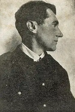 His father was an Irishman, Henry English, who married a Flemish woman, Marie Dinnewet.[1] Later on, Joe was naturalised as a Belgian subject, did initial military service with the Belgian Army in 1902,[1] and collaborated closely with the Antwerp artist Juliaan Devriendt. Antwerp was at that time the centre of the Flemish Movement. In 1914, he was mobilised. At the end of 1915, he worked as an artist in Veurne, where he became a prominent front soldier. He designed the typical gravestones honouring the Flemish soldiers who died in the First World War. English died at the age of 36 from an untreated appendicitis in the military hospital L'Océan at Vinkem on the night of 31 August 1918.[1] He was initially buried in the Belgian military cemetery at Steenkerke. The very first IJzerbedevaart took place there at his sepulchre in 1920. In 1930, his corpse was placed in the crypt of the IJzertoren (the Yser Tower, named after the River Yser) in Diksmuide.[1] Through his friend Samuel De Vriendt, a number of English's oil paintings and water colours, which depict Veurne during the war, were permanently exhibited in the town hall there.