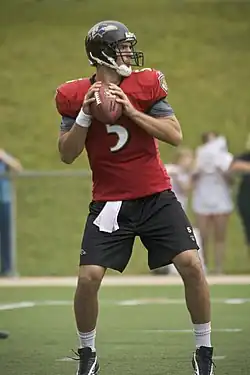 At Delaware, Flacco was pessimistic about his chances to play in the NFL, and after his junior year asked his coach for permission to play baseball. The coach predicted that he would be selected in the NFL draft, surprising Flacco.[22] With a solid showing at the Senior Bowl and NFL Combine, Flacco solidified himself as a top five quarterback in the 2008 NFL draft.[23] Flacco won the long distance throw competition in ESPN's State Farm College Football All-Star Challenge with a 74-yard throw, beating out Matt Ryan, Colt Brennan, Chad Henne, and John David Booty, later winning the Taco Bell Quarterback Scramble with a time of 15.72 seconds.[24]