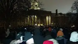 Later that evening, however, the board of trustees voted to terminate Paterno's contract, effective immediately.[2][76] They considered but ultimately rejected the idea of letting Paterno finish out the season, saying that growing outrage at the situation would have made it impossible for him to be effective as coach.[2][77][78] Unable to reach Paterno personally due to the crowd around his house and not wanting Paterno to find out through the media, the board notified him of their decision over the telephone.[79][80] Tom Bradley, Sandusky's successor as defensive coordinator, was named interim head coach for the remainder of the 2011 season. At the same meeting, university president Graham Spanier resigned rather than face being fired as well.[81][82][83][84] That night, several thousand Penn State students chanting Paterno's name rioted in the streets, hurling rocks, tearing down street signs, and overturning a news van.[85]